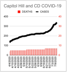 Washington: Daily positives fell from 14.5 to 7.2 per 100K trending up for six weeks, but less steeply than the days before. No daily death was reported but that is caused by several fatalities on one day and zero on the next (which I smooth out afterwards). The daily positive rate gave a little, from 6.0% to 5.9%. Alas, the Capitol Hill neighbourhood of Seattle, my beloved and currently sunny and beautiful home turf, is not spared from this trend.