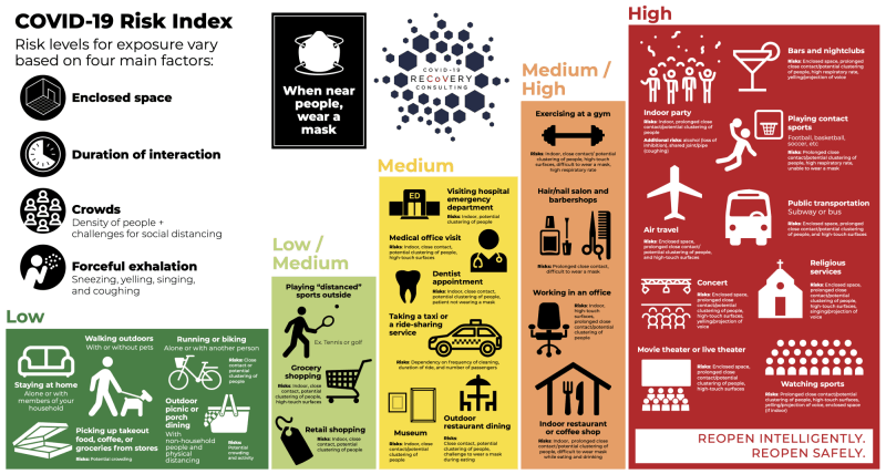 Russ pointed me to this site, Covid-19 RECoVERY Consulting, which has a Risk Index chart for various activities. It shows inside activities involving more than a few strangers with unknown infection status, such as bus, train or plane, as high risk. And I agree.
