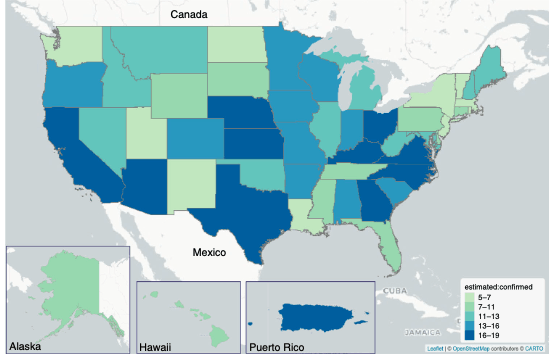 Scientists from Berkeley did a semi-Bayesian probabilistic bias analysis and came to the conclusion that the U.S. has severely underestimated the number of infected people. According to their calculations, there should be about 9x more. Undercounts are distributed very unevenly, as seen in Figure 3b of their publication (below).