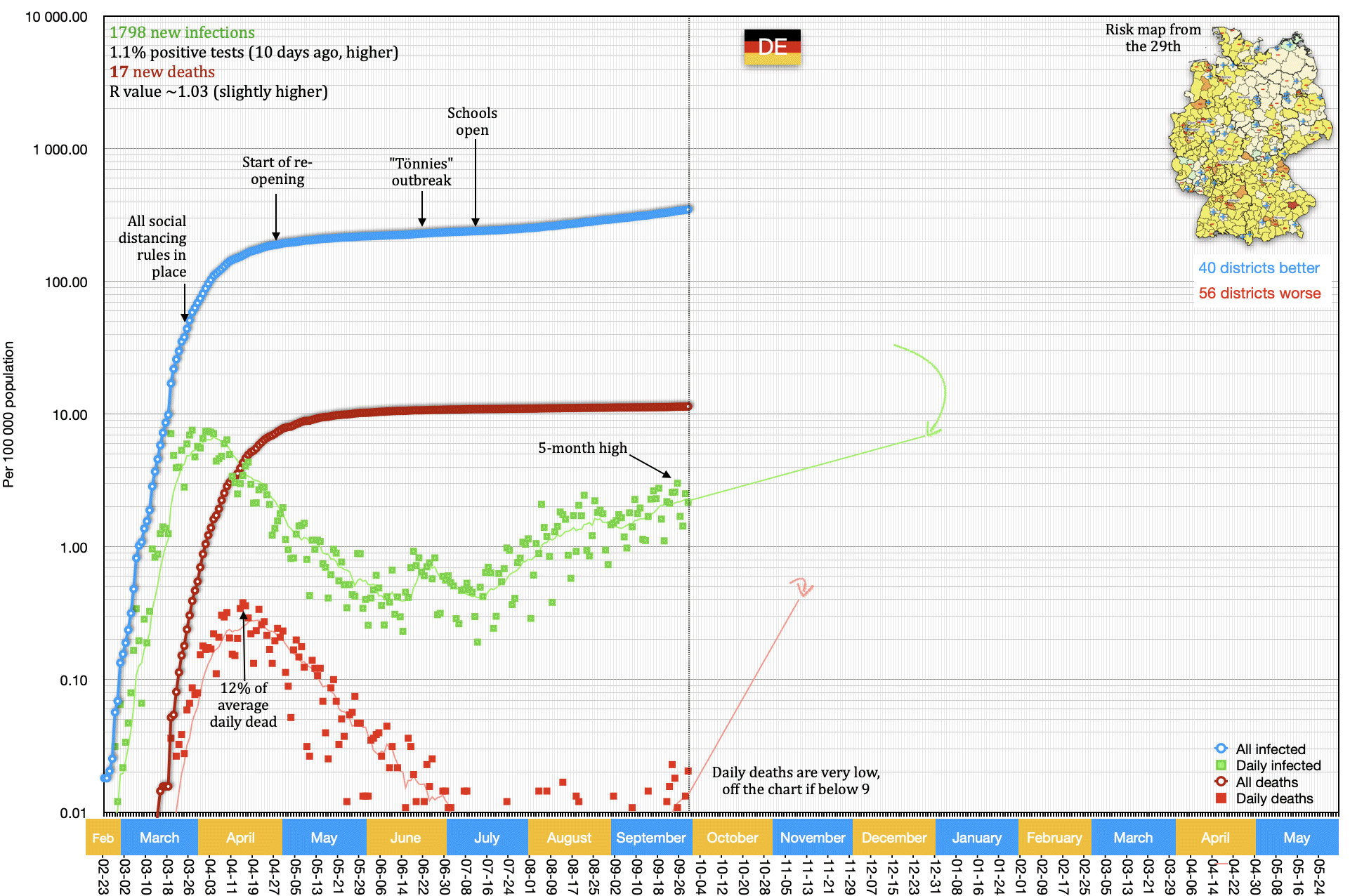 Germany: Daily infections decreased from 3 to 2.2 per 100K while daily death numbers increased from 0.011 to 0.020, both being low. The R-value remained above 1 and the risk map had more districts going for the worse than for the better. It also included more red and orange colours than ever before, in particular in the big cities. Both trendlines are still pointing up and German officials are bracing for worse things to come.