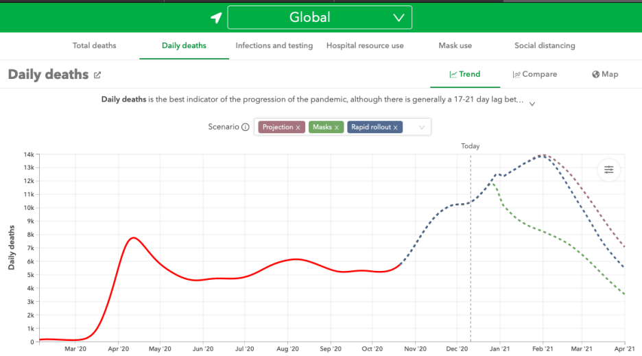 The projections by IHME now also include the effect of the vaccine rollout. Their current projection, that is if nothing were changed, assumes a vaccine rollout to full capacity of 90 days. They are comparing this baseline scenario to two other scenarios: a faster vaccine rollout (within 45 days) or more mask wearing (95% of the population) with a 90 day rollout.