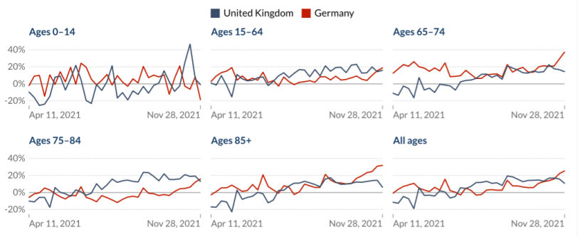 Over the last two months, Germany's mortality rate has been consistently higher than that of Britain, in spite of similar full vaccination rates. Looking at the excess mortality (OWID) by age groups, higher German mortality in people 85 or older started in mid October and the 65-74 displayed the same discrepancy starting in mid November (see popup window). All the while the below 65 showed similar excess mortalities in both countries.