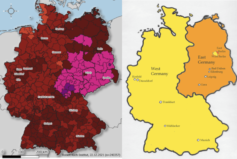 In Germany, the areas with the highest incidence have been predominantly in the southern parts of what used to be East Germany. Coincidentally, the latest incidence map made the old border visible again. Politically, the pink areas in the incidence map are also the counties with the highest number of votes for the far-right AfD party.